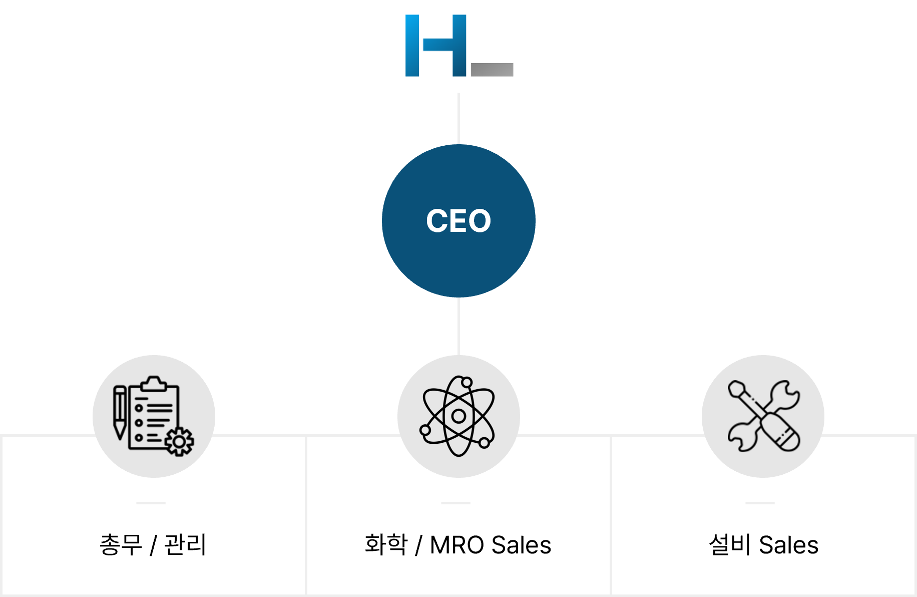 > 조직도 조직도 Team Status 최고보다는 최선을 지향하는 기업 HL Coporation 입니다. 최고보다는 최선을 지향하는 기업 HL Coporation 입니다. 전 직원이 의기투합하여 신규업체 발굴 및 제품개발에 부단히 노력하겠습니다.
